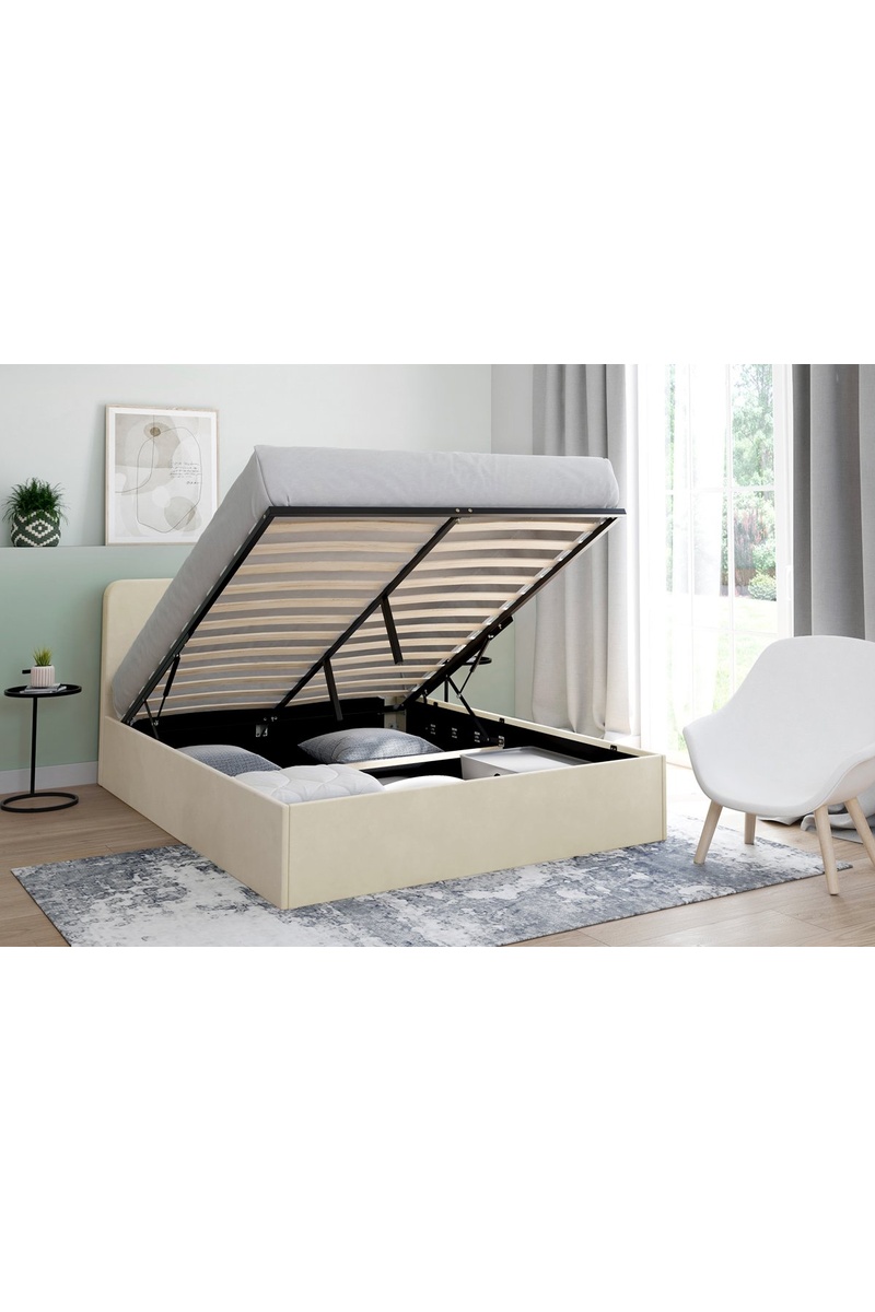 Lit-coffre avec sommier et tête de lit arrondie Louise - Couchage 140 x 190 cm