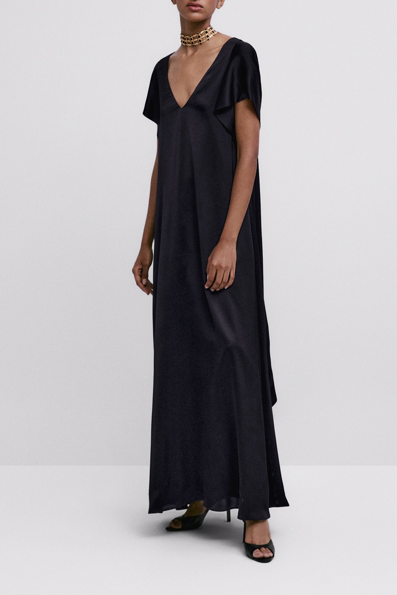 Robe bleu marine satinée confectionnée dans un tissu fluide avec un mouvement et un tombé élégants. Les lanières au niveau des épaules permettent d’apporter une touche unique au vêtement.