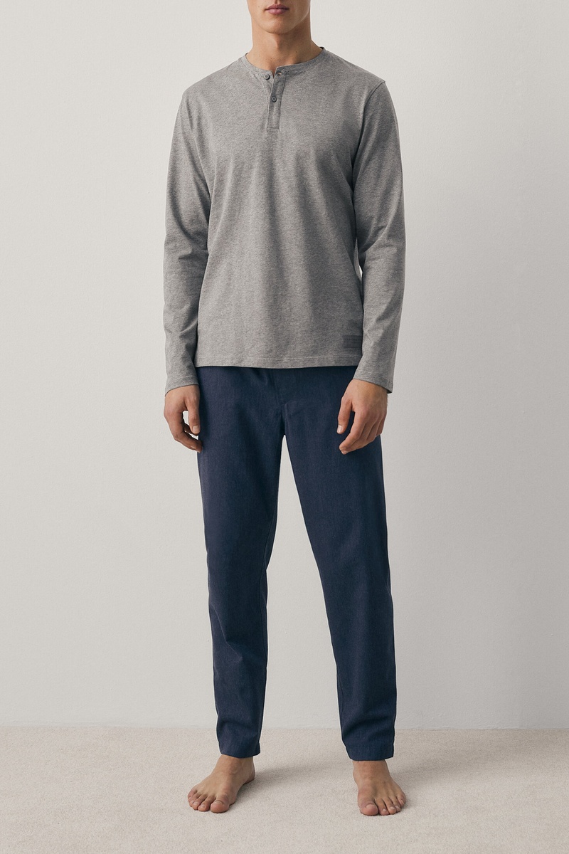Pyjama pantalon motif chevrons et T-shirt col tunisien - Bleu et gris