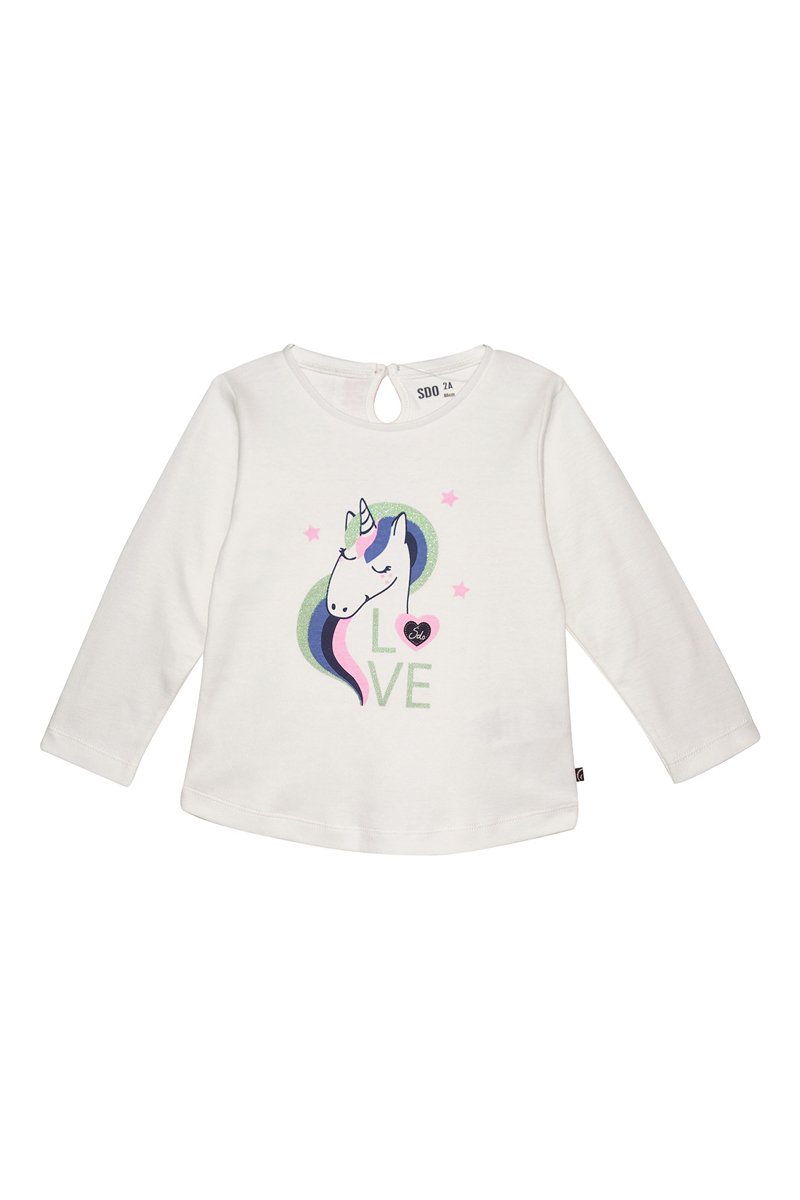 Lettrage, logo, paillettes, motifs licorne et fantaisie devant.