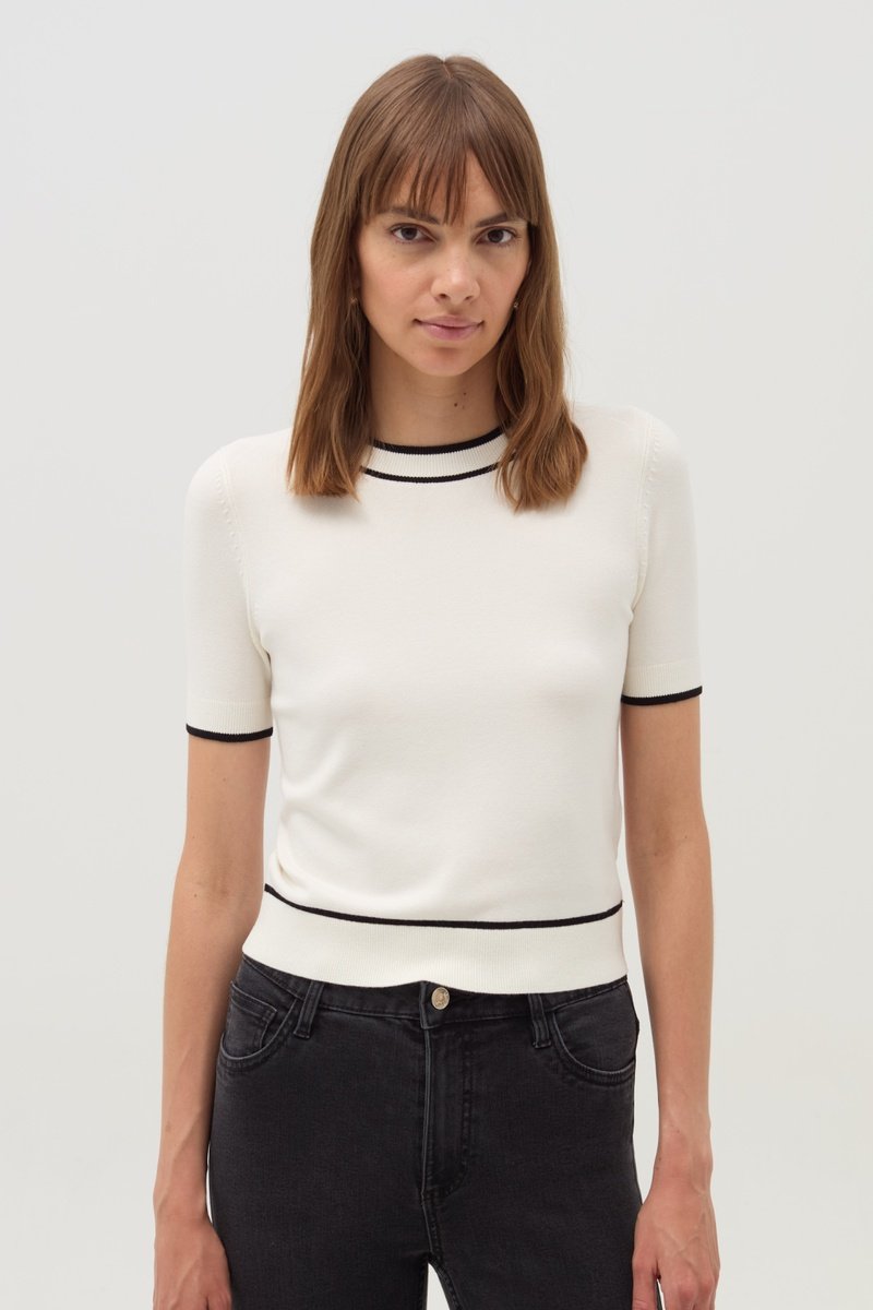 Motifs à rayures à l’encolure, sur les manches et à la base.