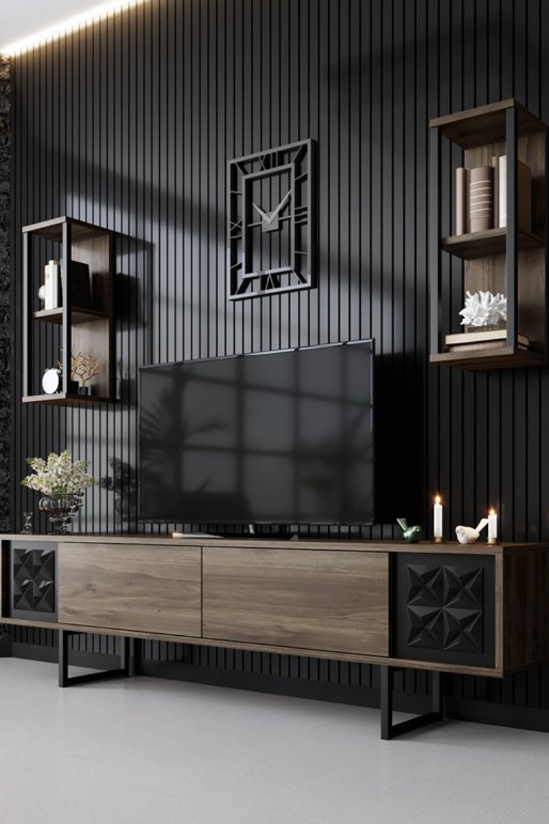 Meuble TV 2 abattants et 2 étagères murales - 180 x 48 x 30 / 2 étagères de 22 x 60 x 21 cm