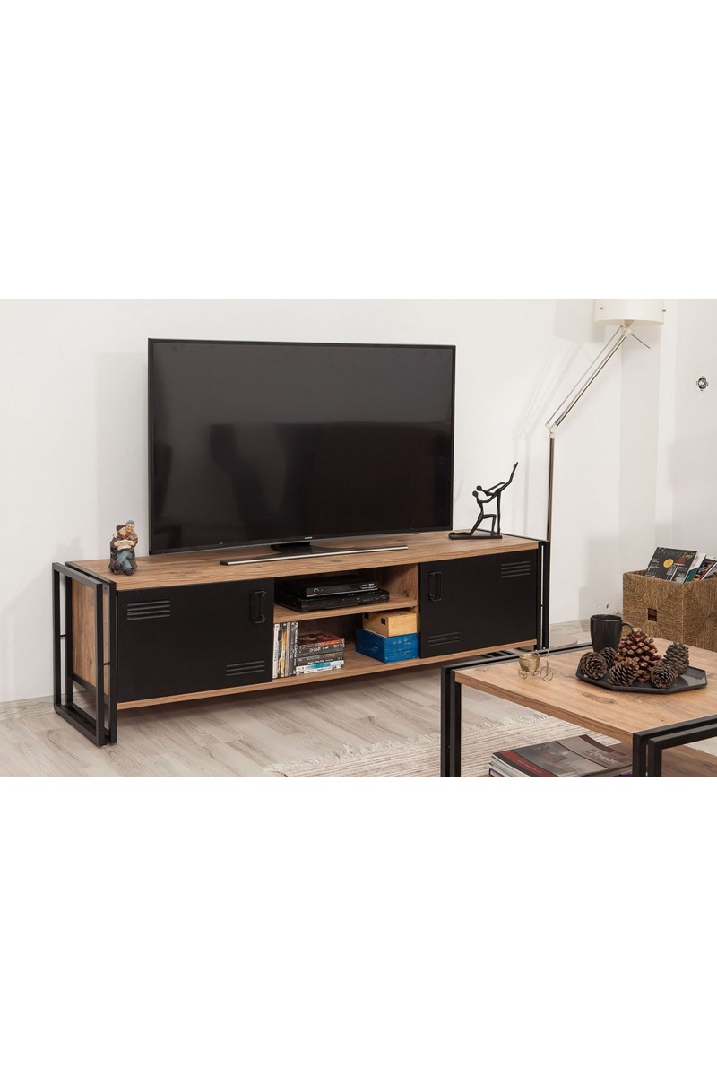 Meuble TV 2 portes Cosmo Rex - Imitation pin noir et camel