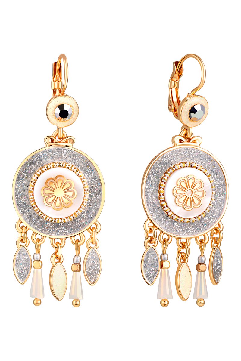 Boucles d'oreilles pendantes serties de cristaux et de nacre.