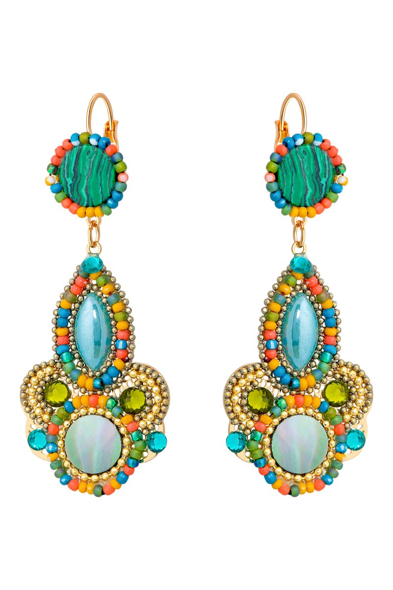 Boucles d'oreilles pendantes serties de cristaux, de malachite et de nacre.