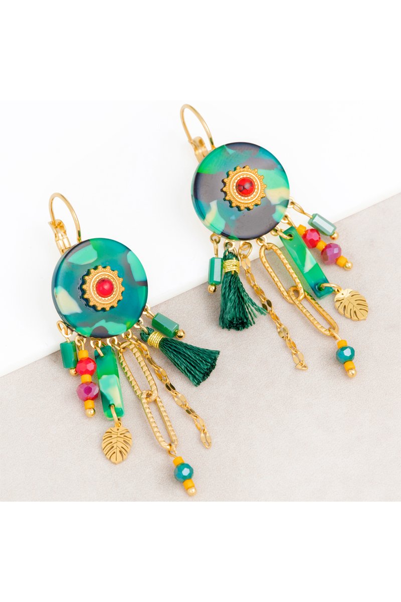 Boucles d'oreilles dorées à l'or fin jaune serties d'un jaspe, de cristaux et de perles fantaisie.