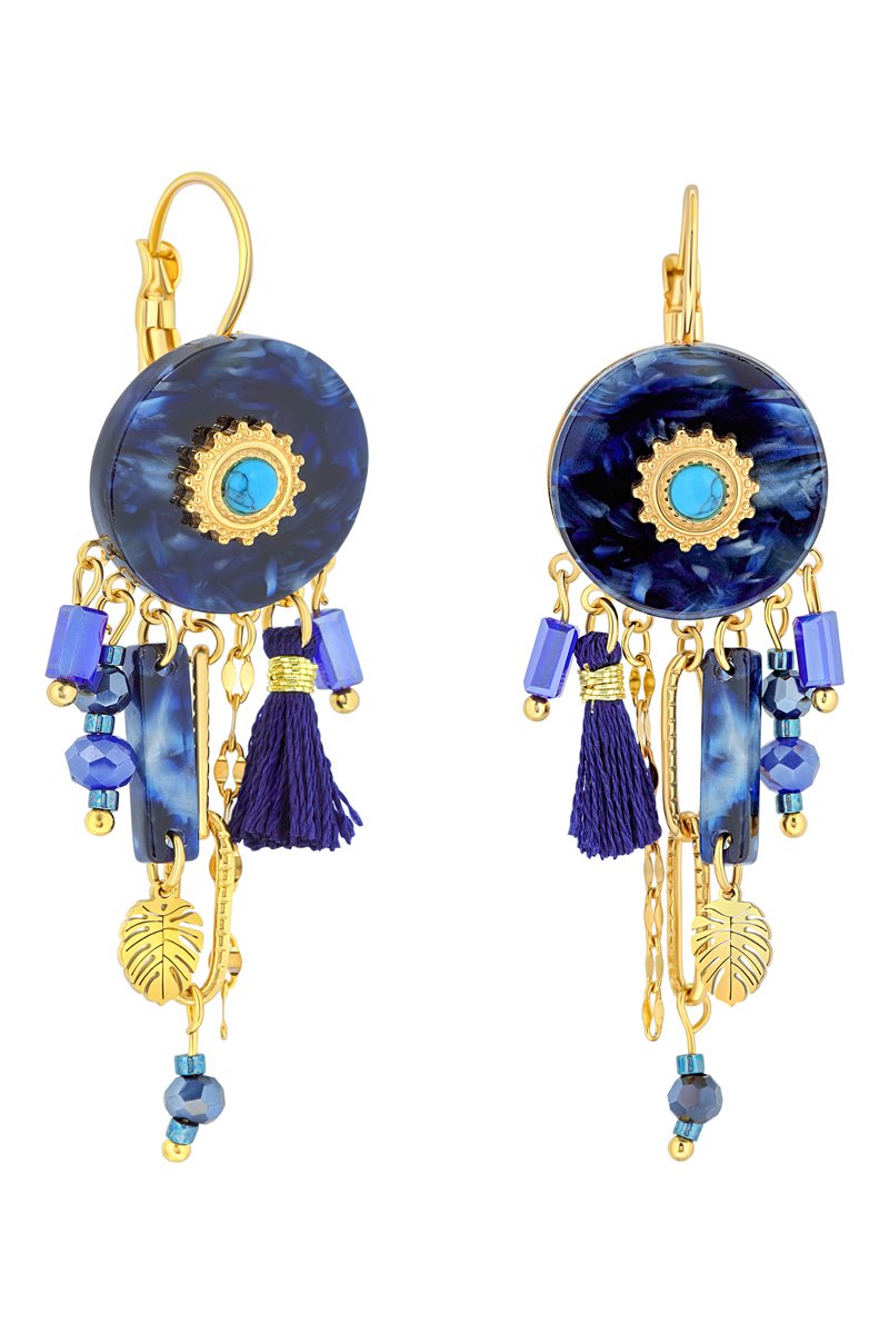 Matière : acier inoxydable doré à l'or fin jaune, turquoises, résine, cristaux et pompons