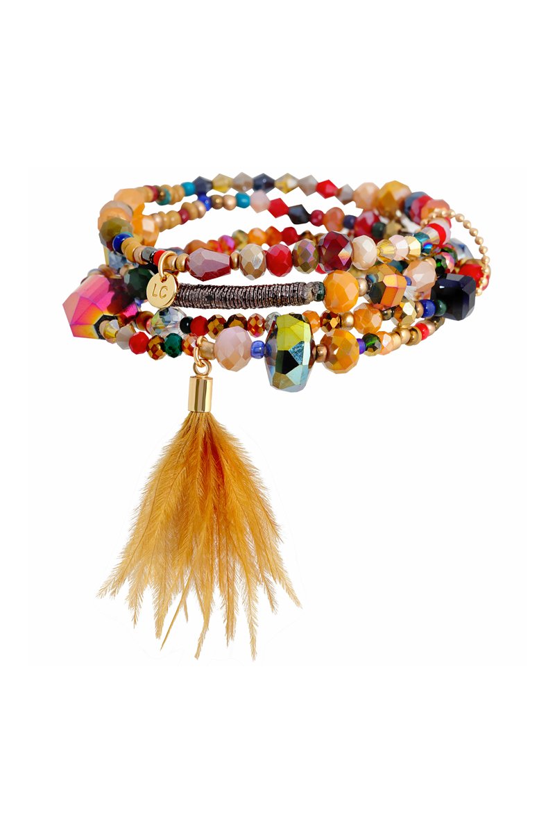 Bracelet multirangs orné de plumes et de cristaux synthétiques.