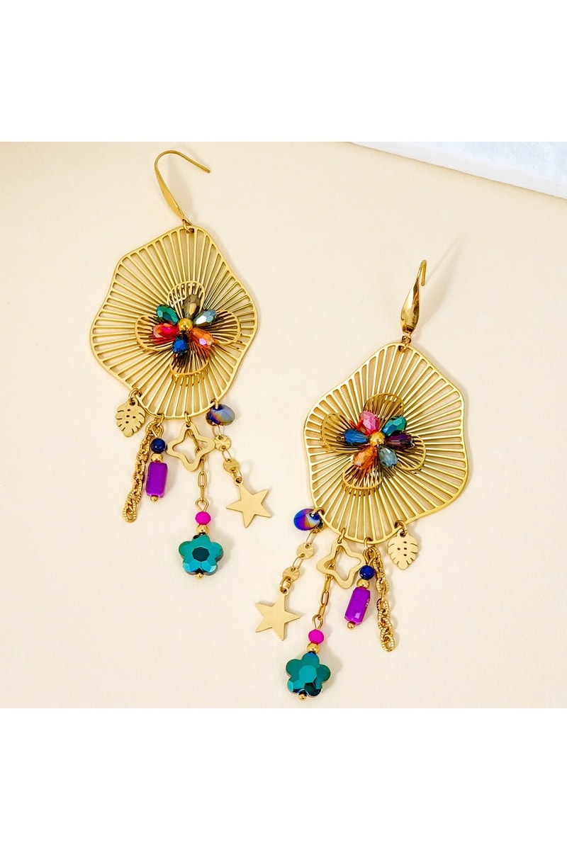 Boucles d’oreilles pendantes dorées à l’or fin jaune serties de cristaux.