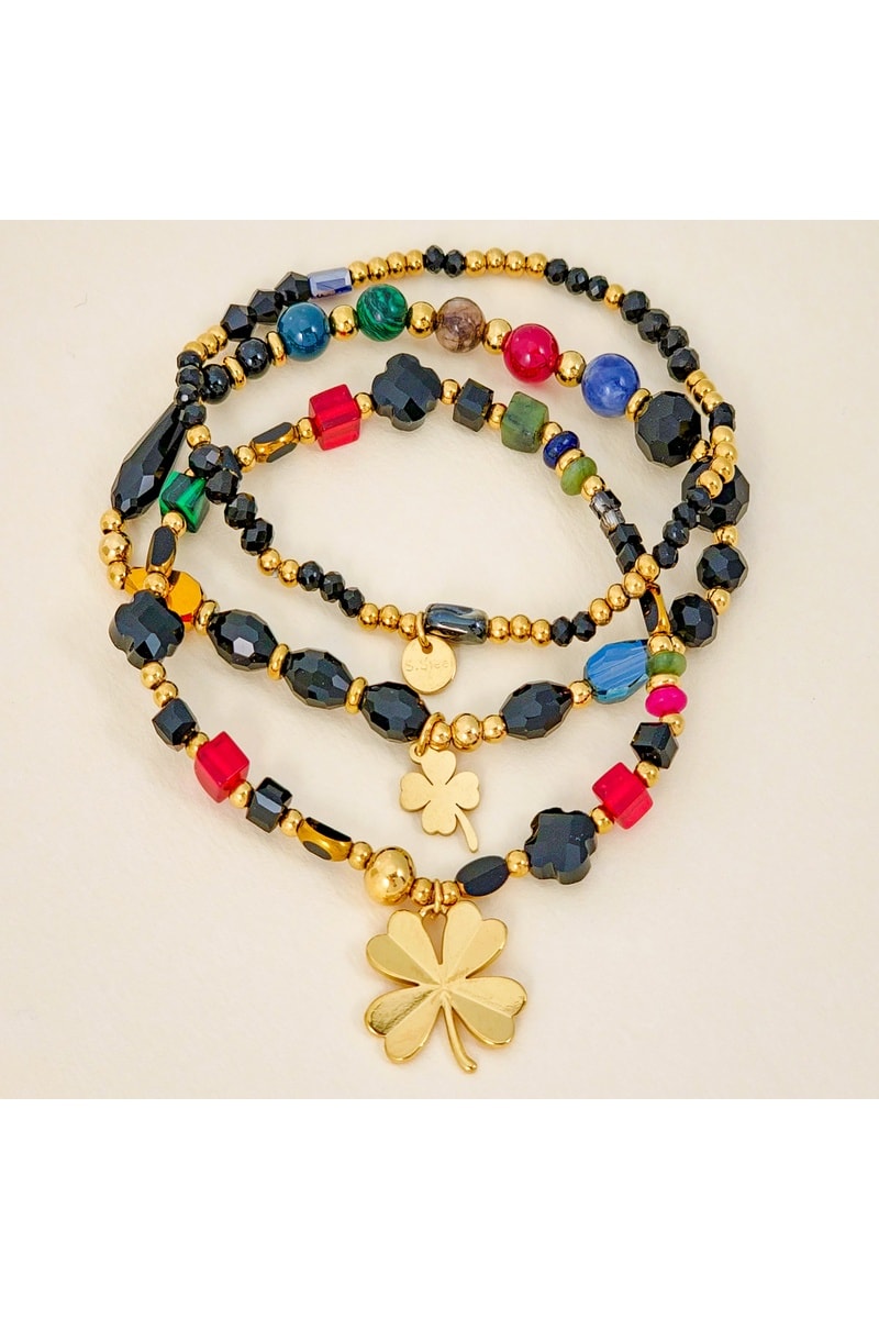 3 bracelets élastiques dorés à l’or fin jaune sertis de cristaux et de perles d’imitation.