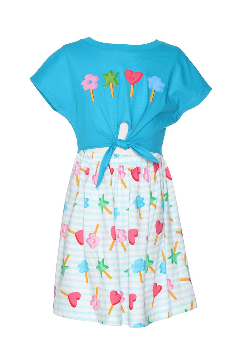 Motifs à rayures et fantaisie devant et sur la jupe.