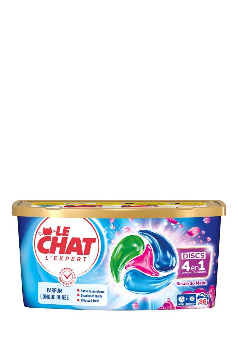 Le Chat Discs L'Expert Rosée du Matin, la capsule 4-en-1 qui garantit une efficacité complète et sans effort, laissant votre linge impeccable avec un parfum délicat, même lavé à basse température.