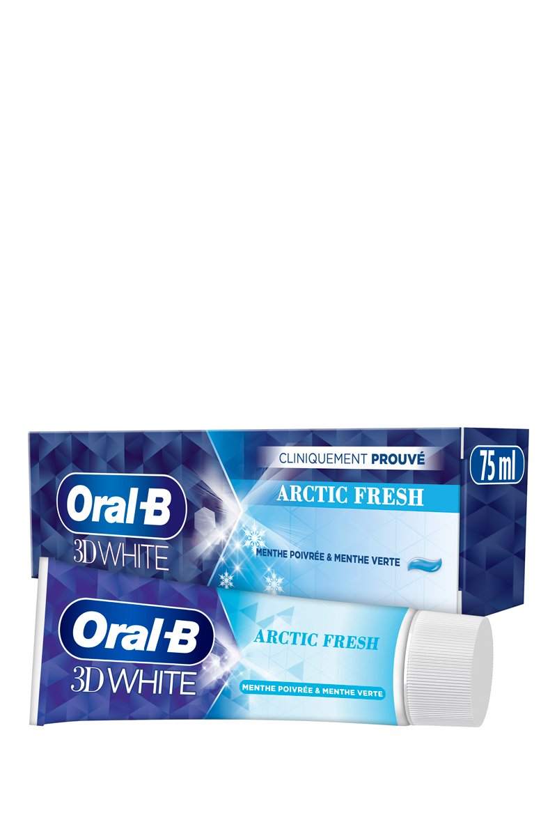 Il est cliniquement prouvé que le dentifrice Oral-B 3D White Arctic Fresh élimine jusqu’à 87 % des taches en surface et commence à blanchir les dents dès le premier brossage.