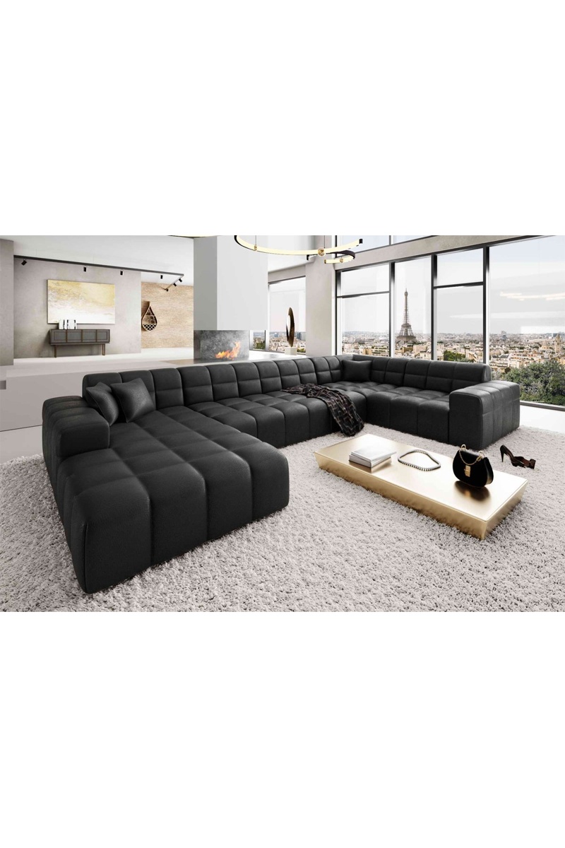 Canapé d'angle droit panoramique Cardano - Noir - 7 places - En cuir