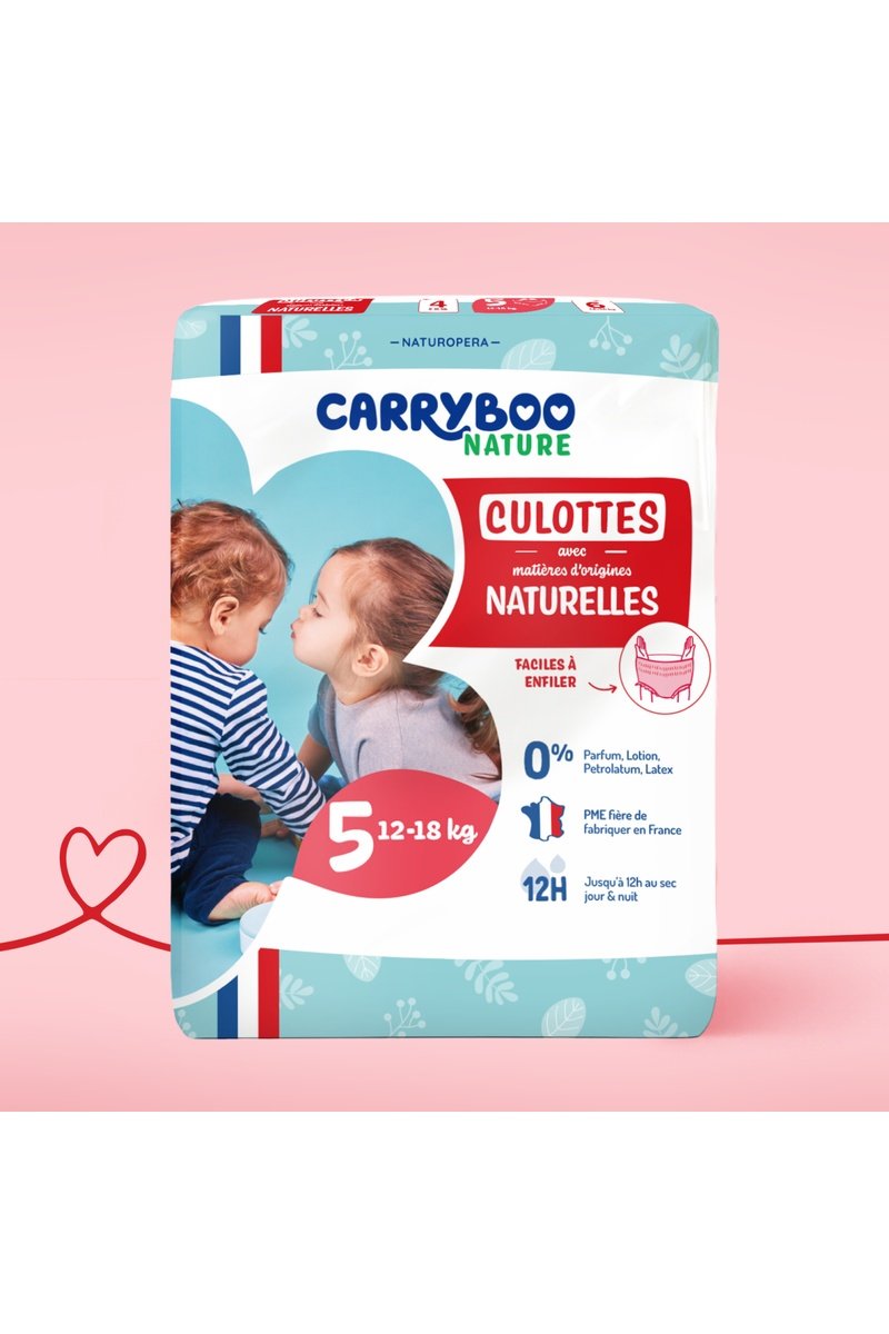 Carryboo propose des couches dermo-testées, fabriquées en Europe, avec un voile au contact de la peau d’origine naturelle et sans substances controversées. Choisir Carryboo, c’est opter pour une protection fiable, douce et responsable pour le bien-être de bébé aujourd’hui et le monde de demain.