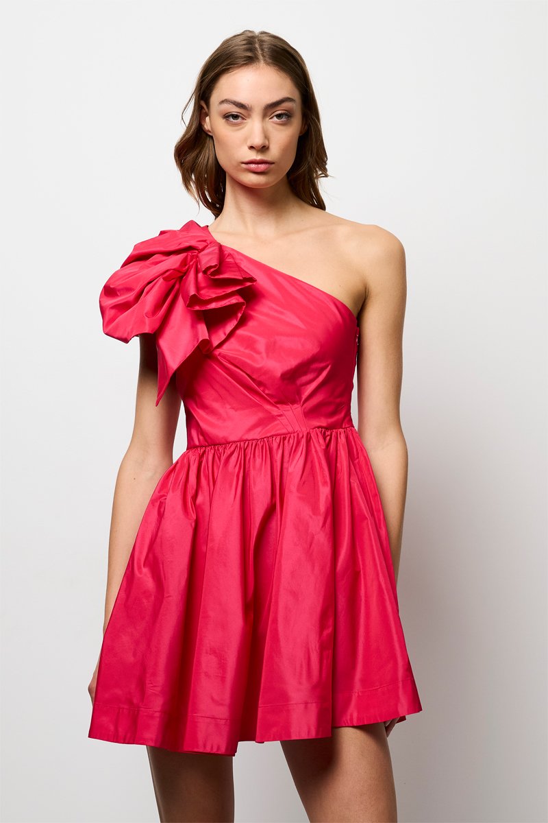 Sans manche sur le côté gauche et manche courte bouffante sur le côté droit.