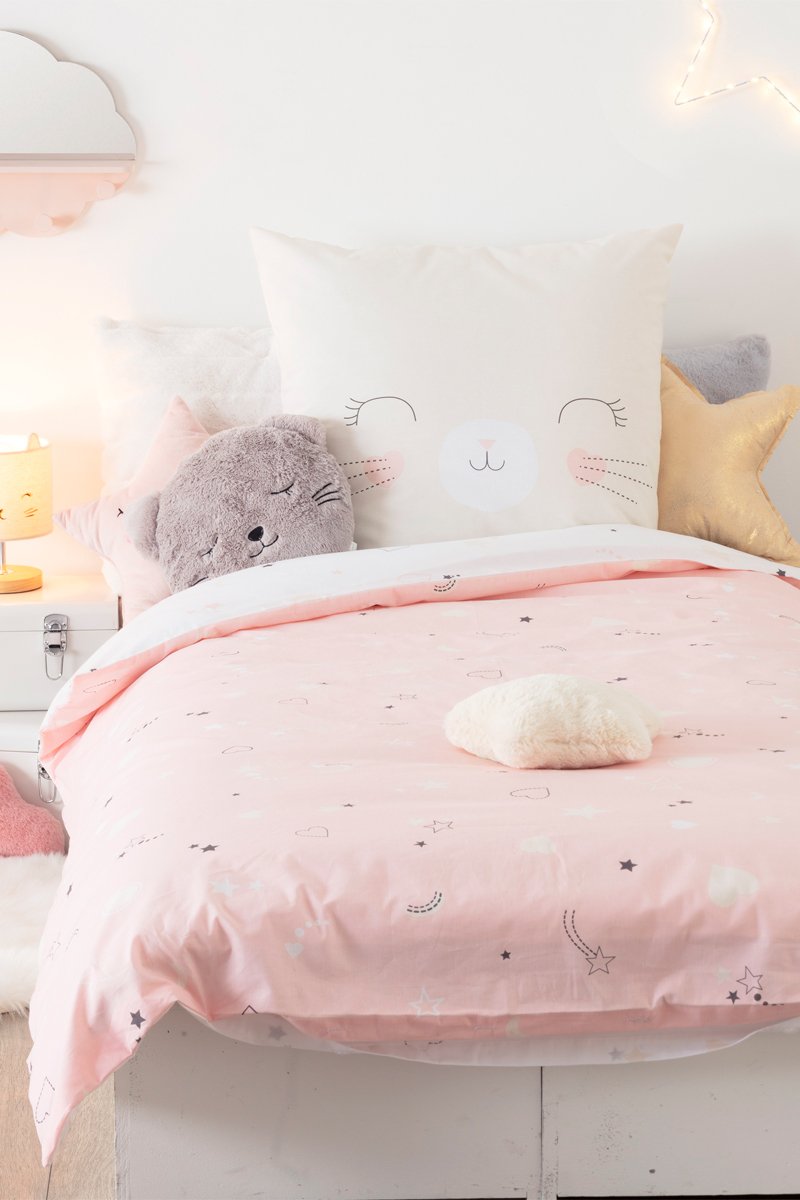 Parure de couette en coton 115 g/m² Chat - Rose et blanc