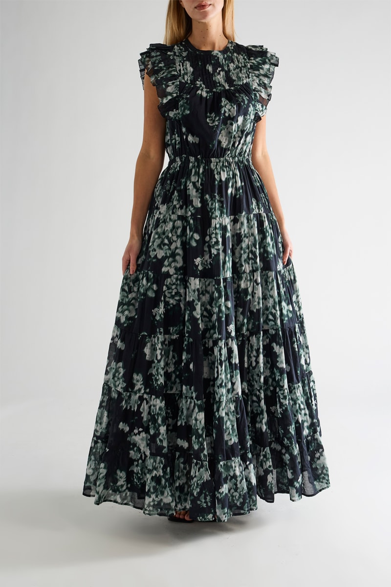 Robe longue à manches courtes volantées.