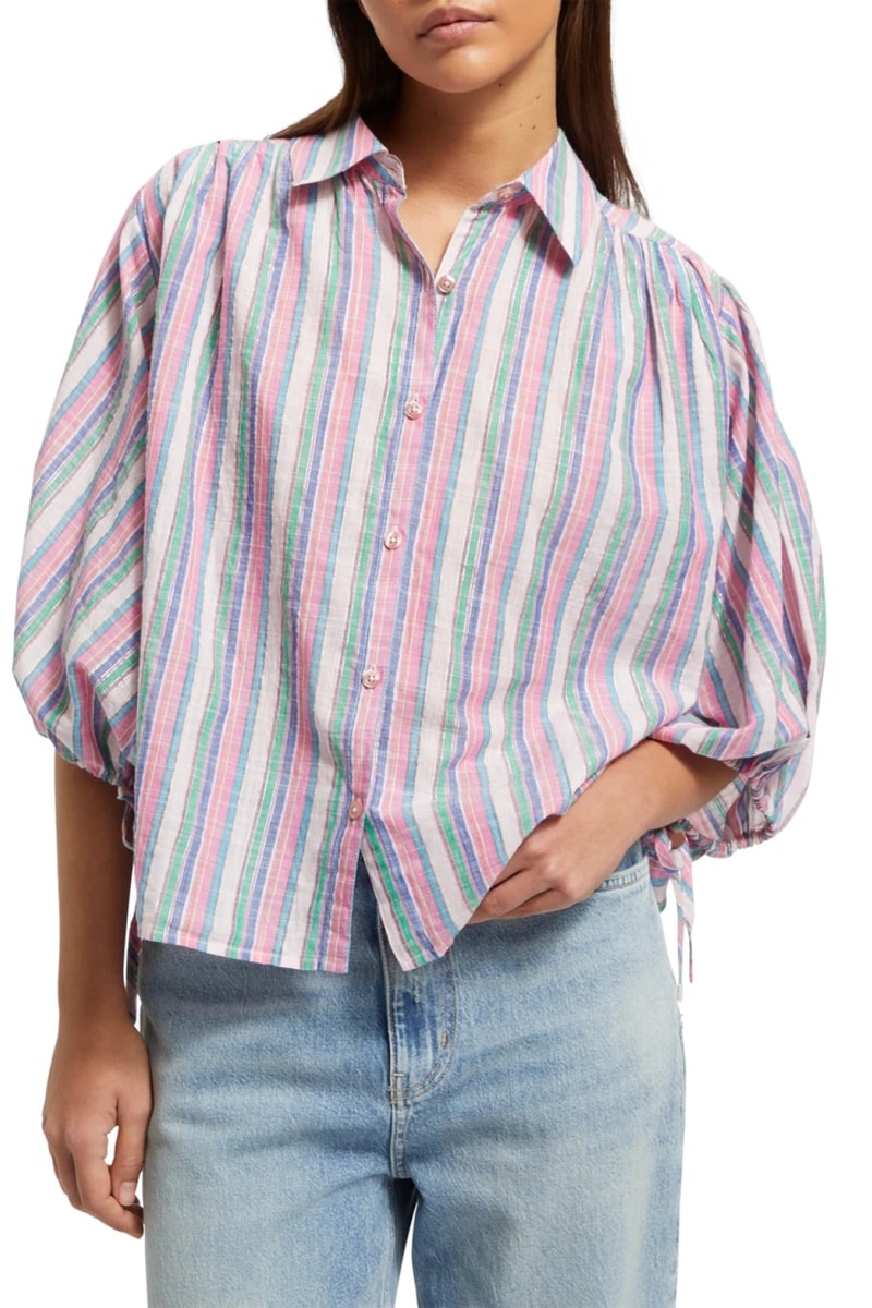 Chemisier à manches 3/4 bouffantes avec liens de serrage.