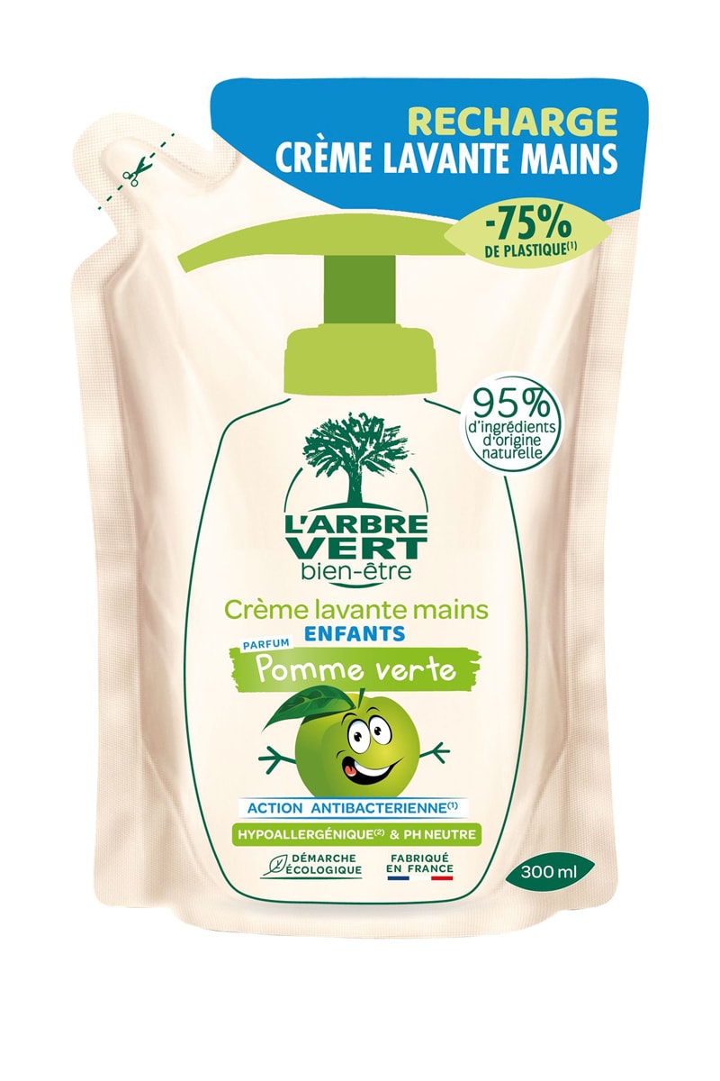 Conseils d’utilisation : dévisser, retirer la pompe-doseuse du flacon et rincer le flacon réutilisable, avant remplissage. Avec une paire de ciseaux, découper suivant les pointillés et verser le contenu de la recharge dans le flacon. Revisser la pompe-doseuse sur le flacon.