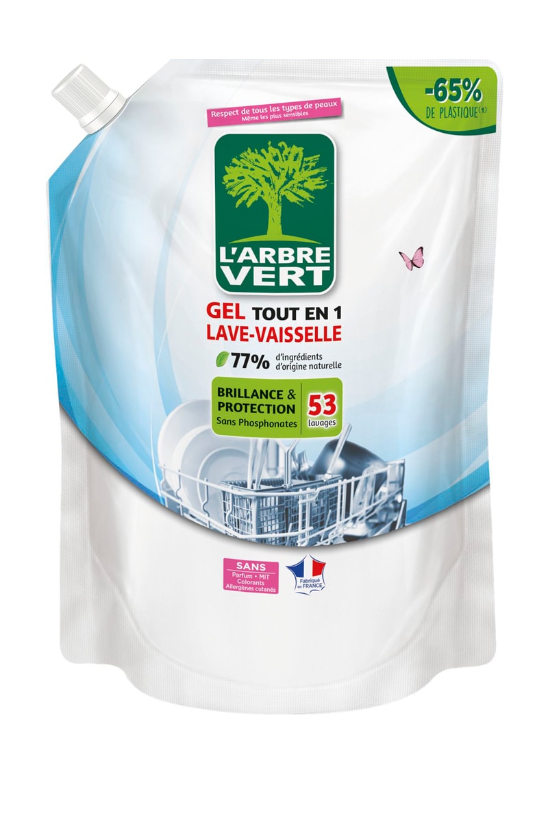 Conseils d'utilisation : à vous de choisir, deux utilisations possibles. Dans les deux cas, 65 % de plastique en moins par rapport au flacon. Utilisation directe : Ouvrir le bouchon de la poche et verser directement dans le bac de remplissage du lave-vaisselle en la renversant doucement, doser 17 ml au niveau indiqué dans le bac. Fermer le bac et le produit. Utilisation en recharge : Ouvrir le bouchon du flacon GEL LAVE-VAISSELLE TOUT EN 1 L’ARBRE VERT. Toujours rincer le flacon réutilisable avant tout remplissage. Dévisser le bouchon de la recharge, verser le contenu dans le flacon puis le refermer. Ouvrir le flacon, le presser légèrement et doser 17 ml grâce au bac de remplissage du lave-vaisselle, puis fermer le bac et le produit. S’il reste du gel dans la poche, la refermer avec le bouchon et la stocker hors de portée des enfants. Pour les verres, utiliser le programme spécial verre ou un programme basse température. Régler le lave-vaisselle selon la dureté de l’eau : si la dureté est = 25°fH ou 250 ppm de CaCO3, ajouter du liquide de rinçage et du sel régénérant afin d’éviter les traces blanches.