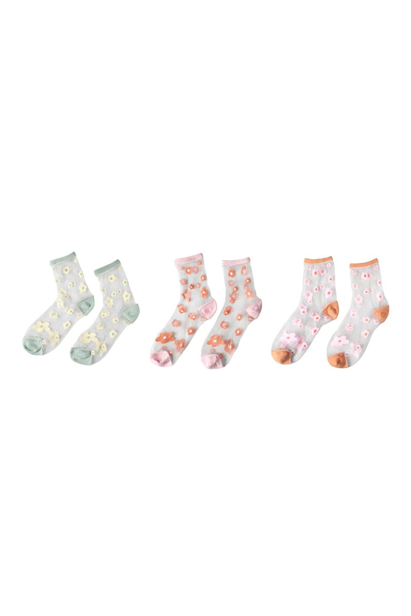 Ce joli coffret Flower Power est composé de 3 paires de chaussettes transparentes à fleurs.