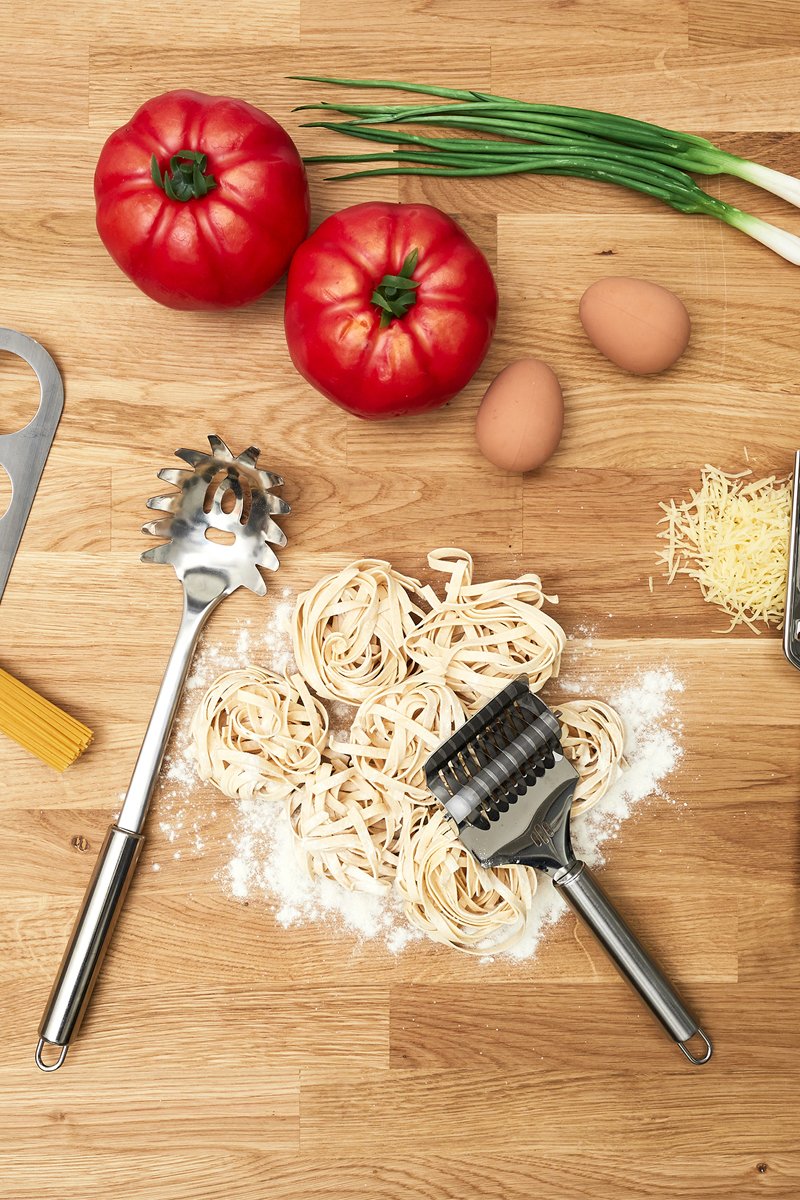 Il est doté de 4 ustensiles de cuisine pour faire vos propres pâtes, râper le fromage ou encore mesurer la quantité de pâte à cuire, le tout dans une jolie boîte.