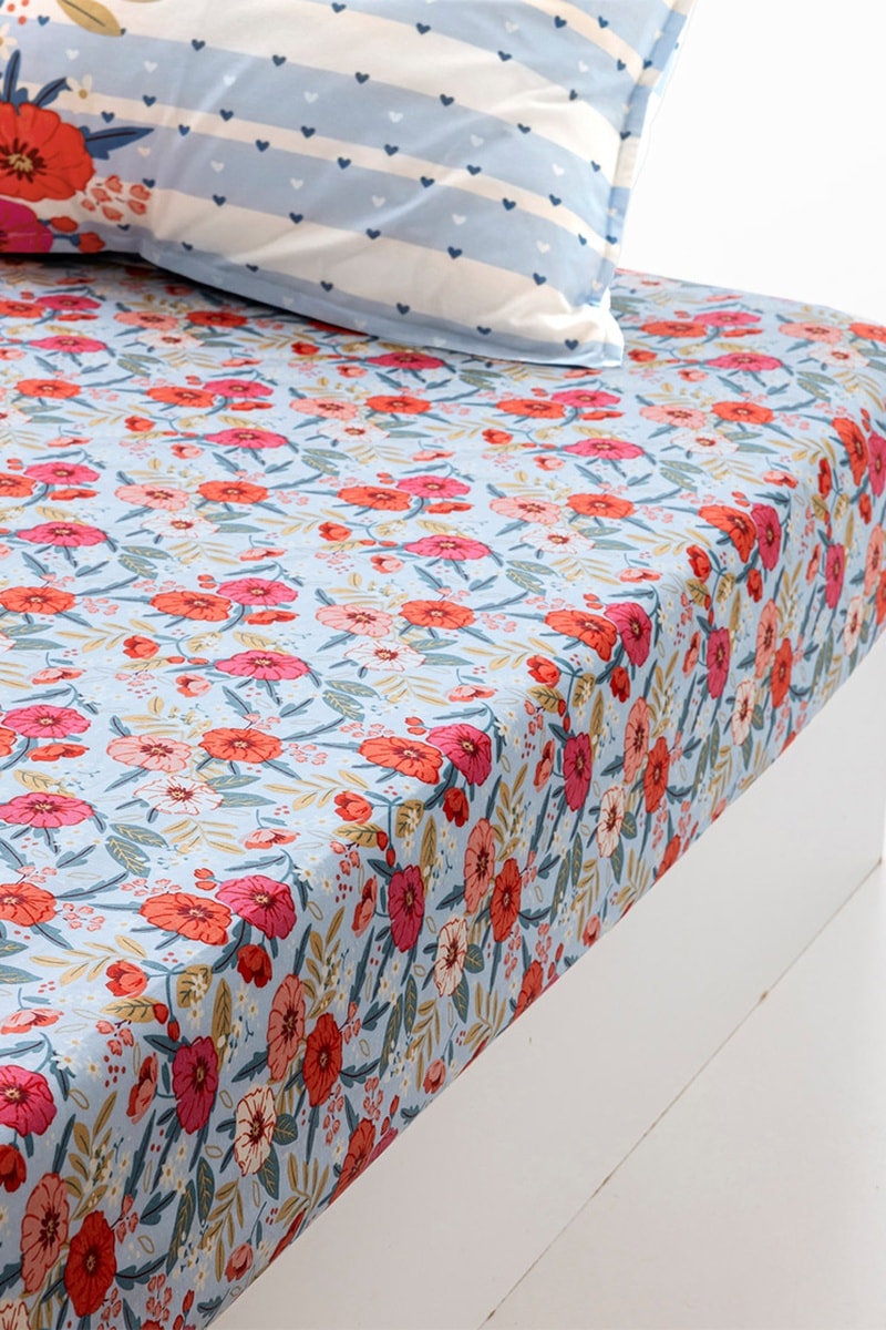 Drap-housse en coton Horizons Fleuris - 57 fils/cm² - Bleu