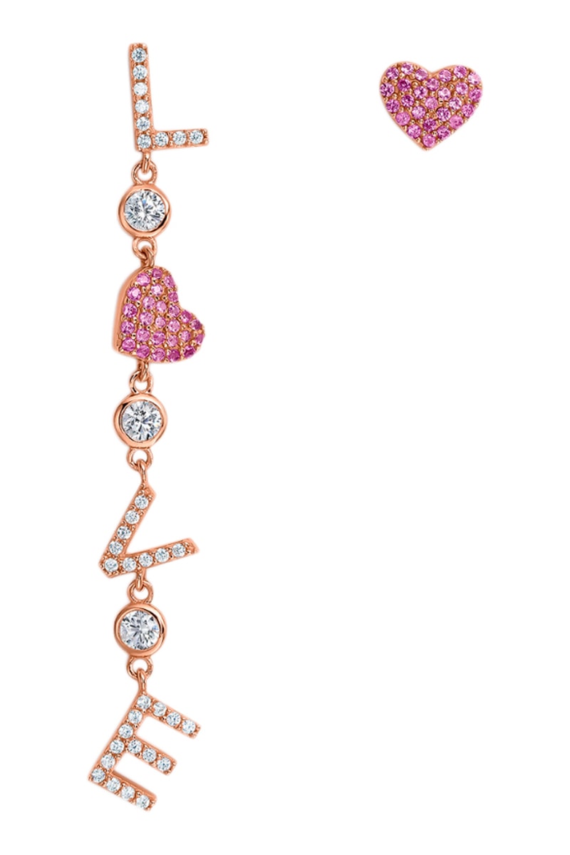 Boucles d’oreilles dépareillées en argent plaqué or rose et plaqué or rose serties de corindons et zircones cubiques.