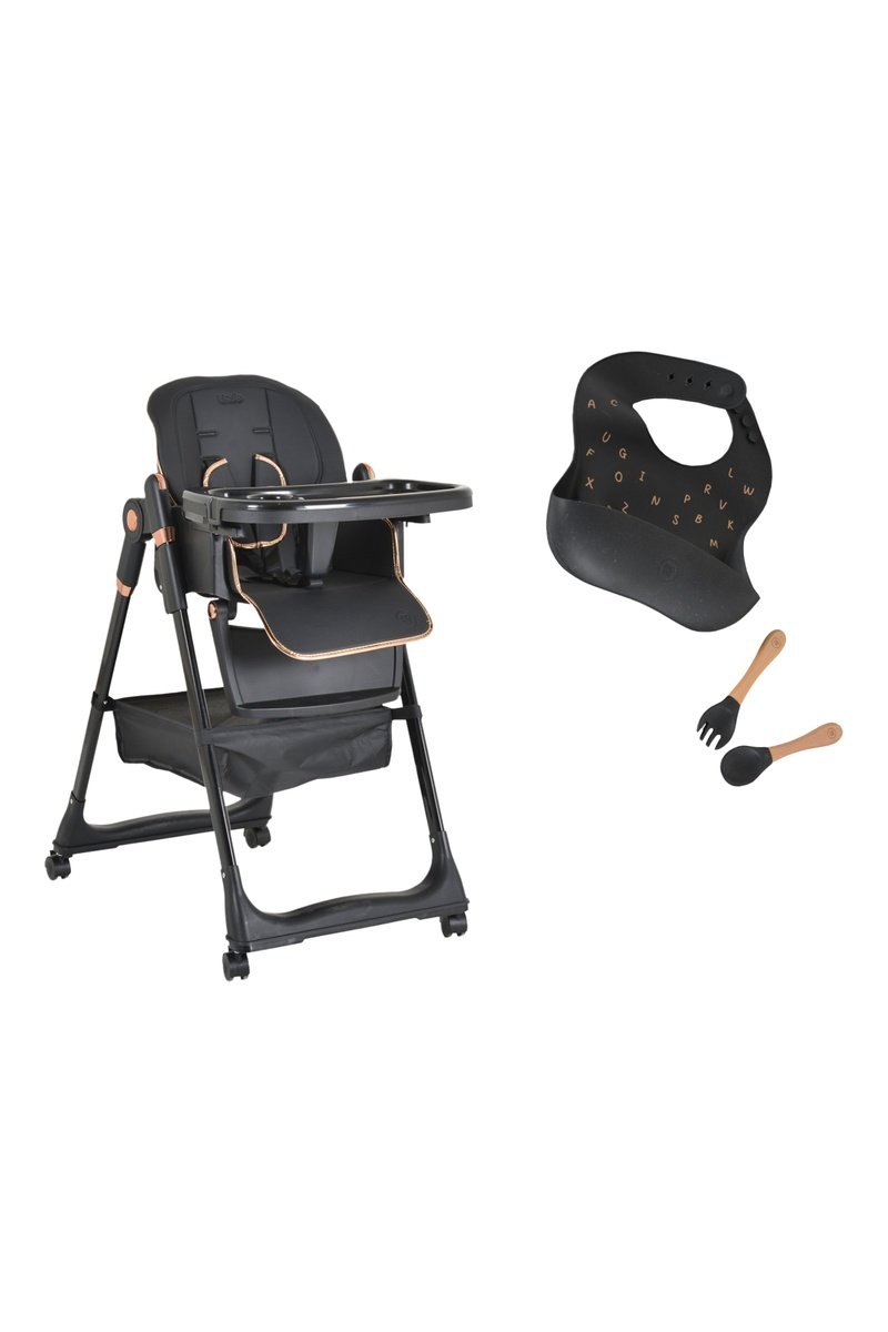 Chaise haute évolutive à roulettes pliable.