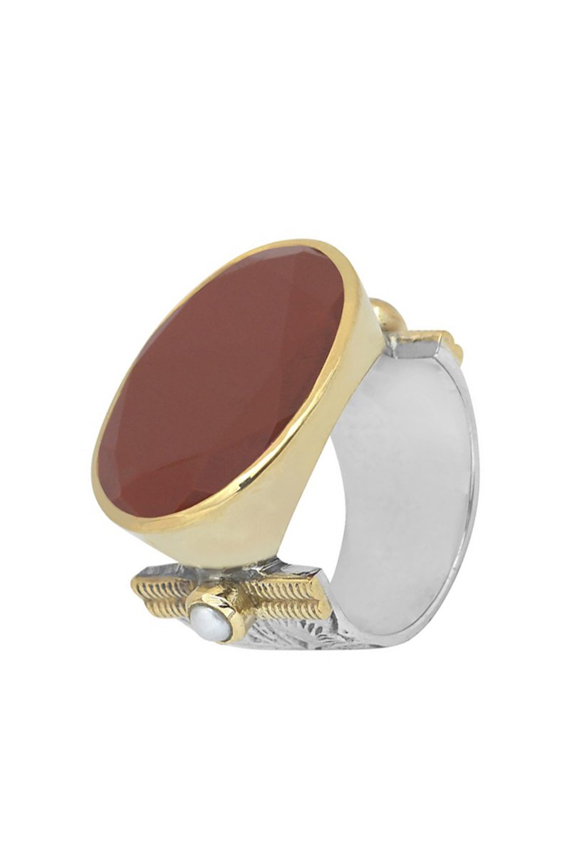 Bague en argent sertie de jaspe et de 2 perles d'imitation.