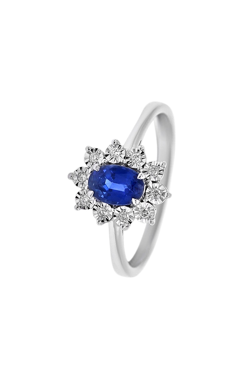 Matière : or blanc 750 / 1000 et diamants 0,05 carat/10 et saphir 0,6 carat/1