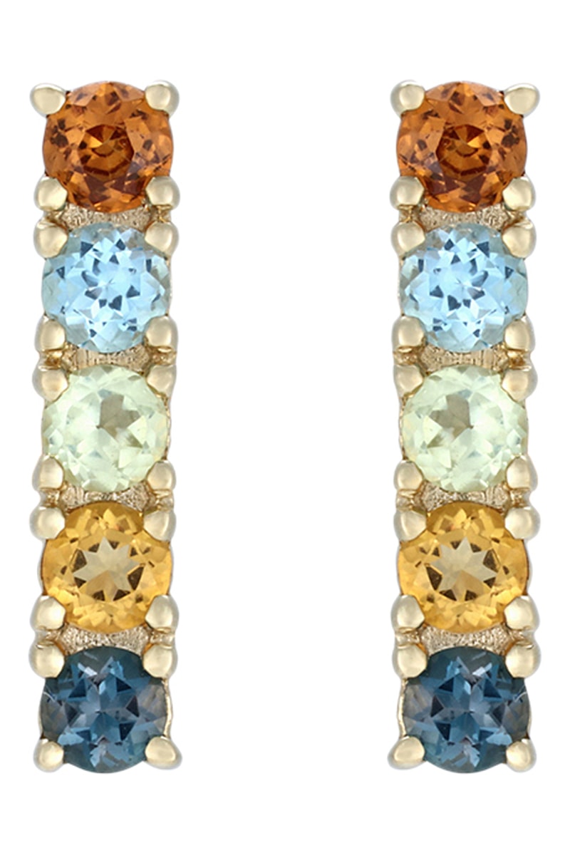 Puces en or jaune serties d'un quartz, d'un topaze bleue, d'un péridot, d'une citrine et d'une hématite.