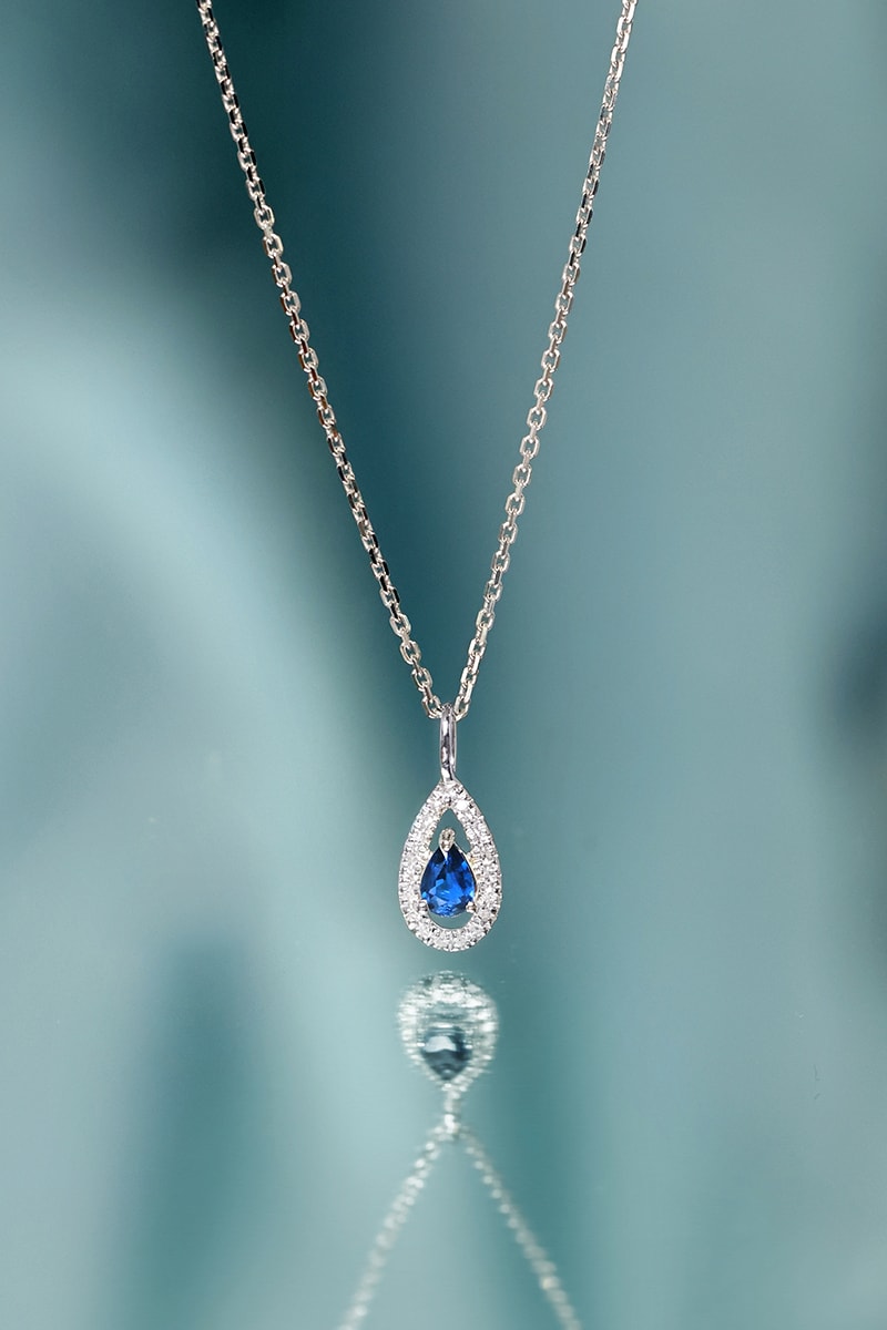 Pendentif en or blanc serti de 19 diamants et d'un saphir.