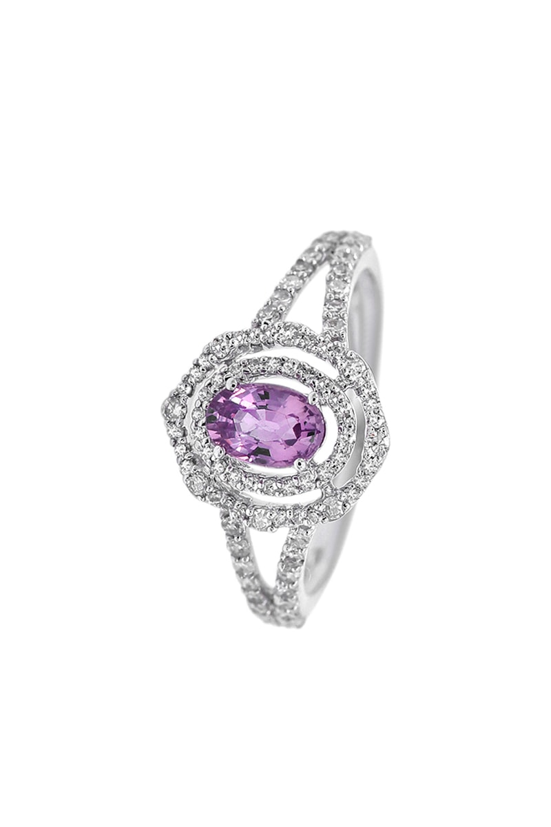 Bague en or blanc sertie de 86 diamants et d'un saphir rose.