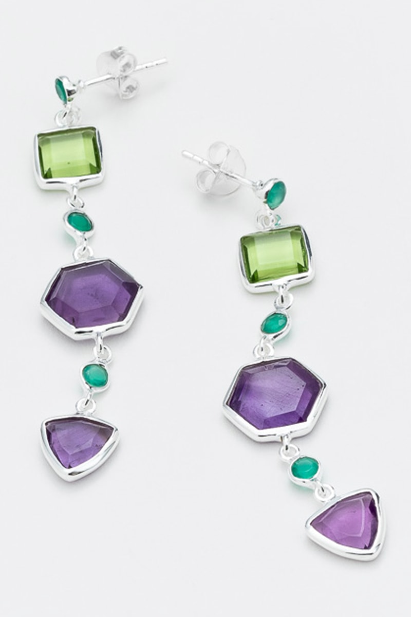 Boucles d'oreilles pendantes en argent serties de améthyste, de péridot et de onyx.