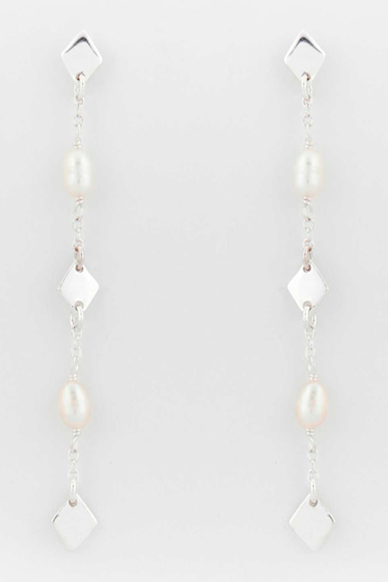 Boucles d'oreilles pendantes en argent serties de perles d'imitation.