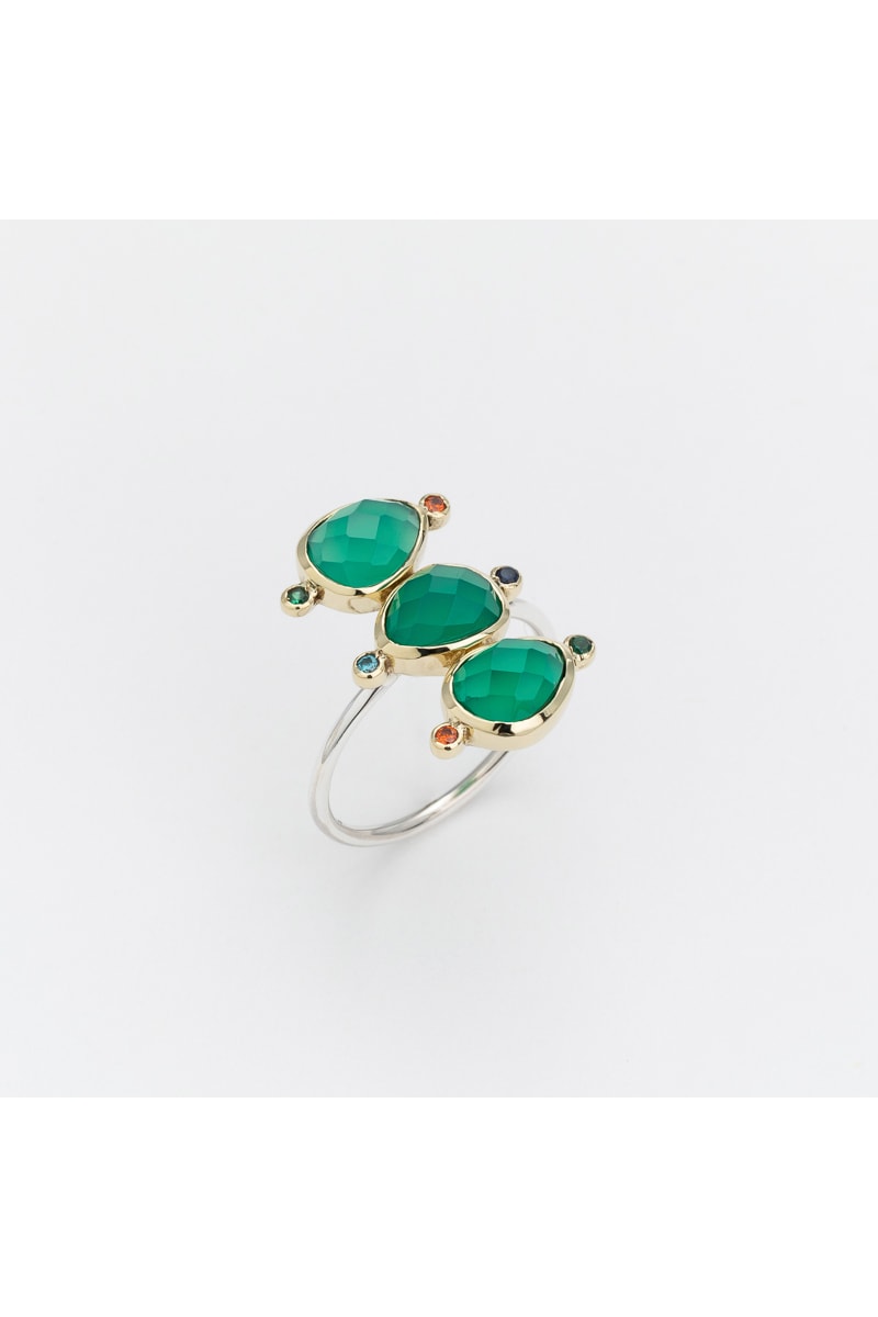 Bague en argent et laiton sertie de 3 onyx vert et de 6 oxyde de zirconium.