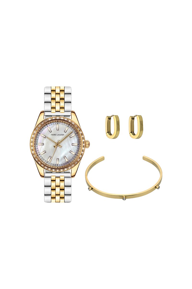 Coffret montre à quartz en acier et zircons, boucles d'oreilles et jonc Tirana