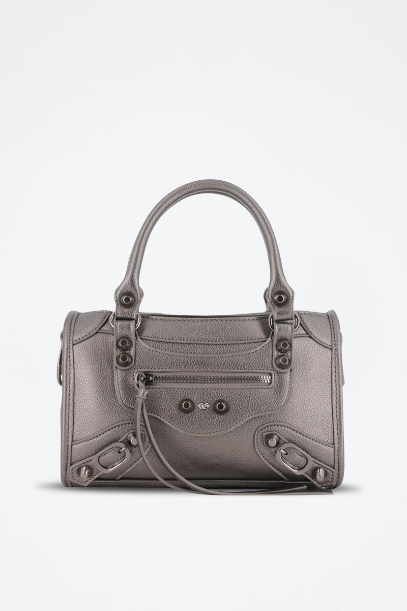 Poche zippée avec tirette, empiècements en métal, patte à boucle et logo métallique devant.