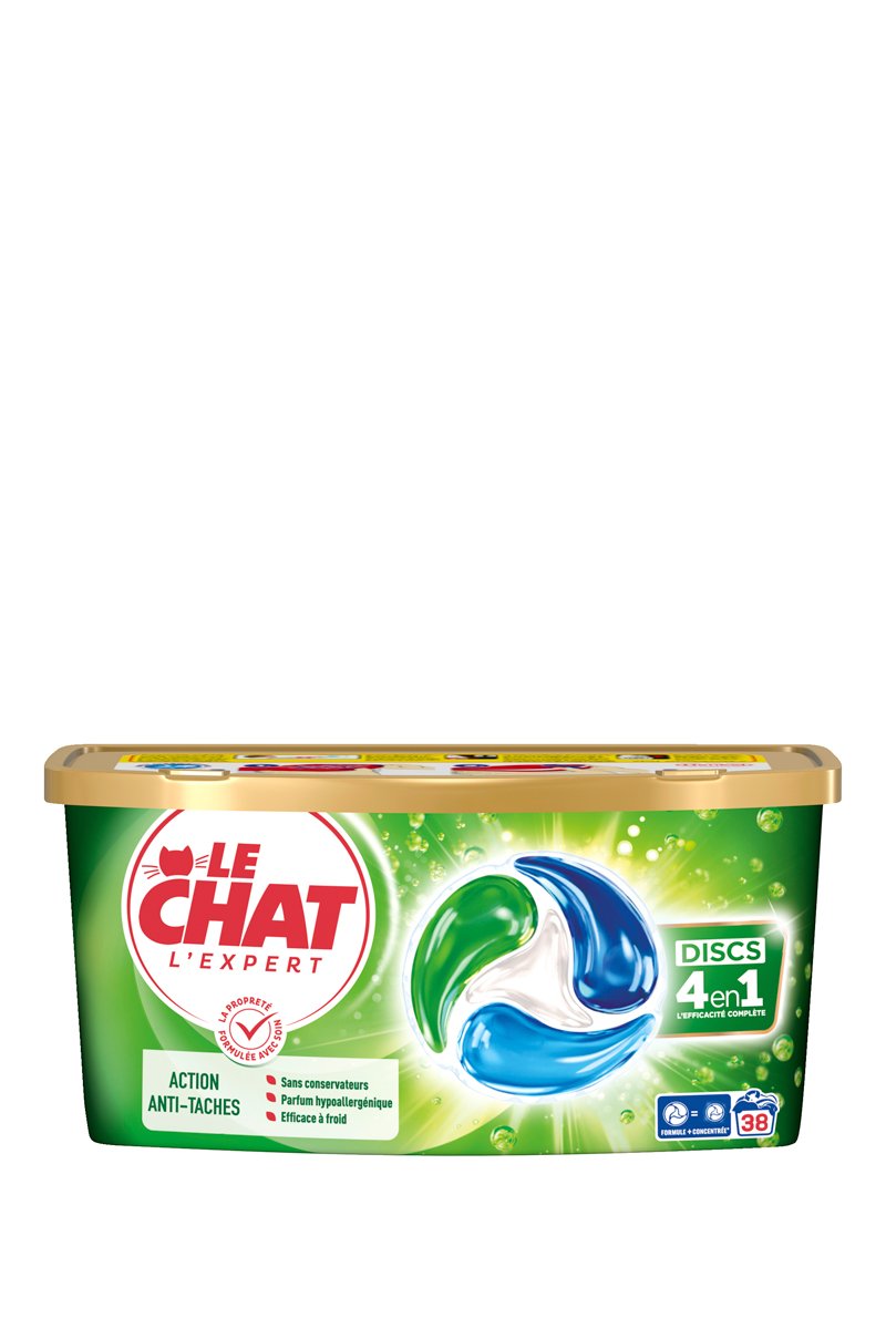 Le Chat Discs L'Expert, la capsule 4-en-1 qui vous assure une performance complète et sans effort, laissant votre linge frais et impeccable, même lavé à basse température.