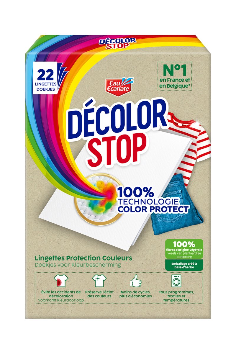 La nouvelle gamme de lingettes Décolor Stop dont l'emballage est fabriqué à partir d'herbe préserve l'éclat des couleurs lavage après lavage, grâce à la technologie 100% Color Protect.