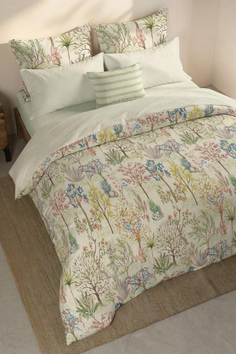 Housse de couette réversible en percale de coton 79 fils/cm² Alcudia - Ecru et vert foncé