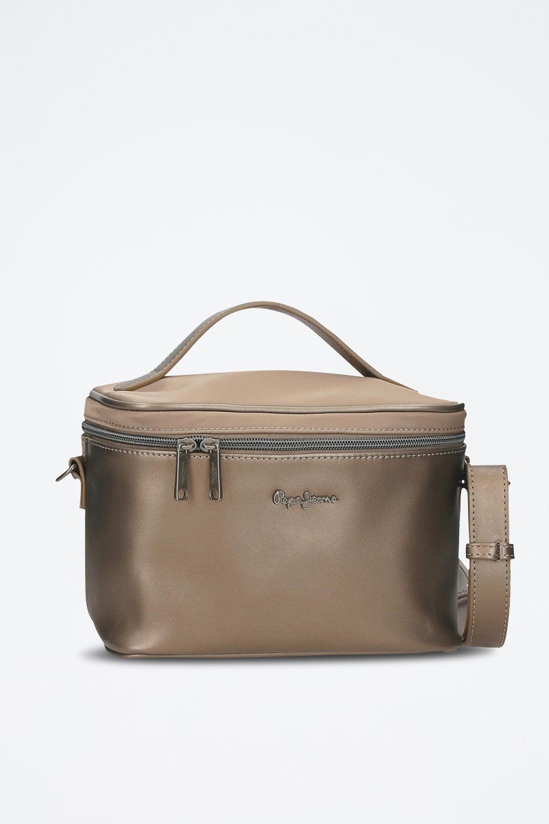Effet cuir et métallisé et logo métallique devant.