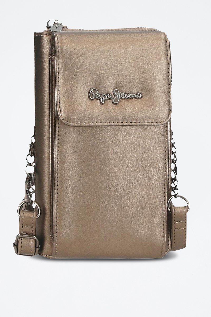 Poche à rabat pressionné pour téléphone, effet cuir et logo métallique devant.