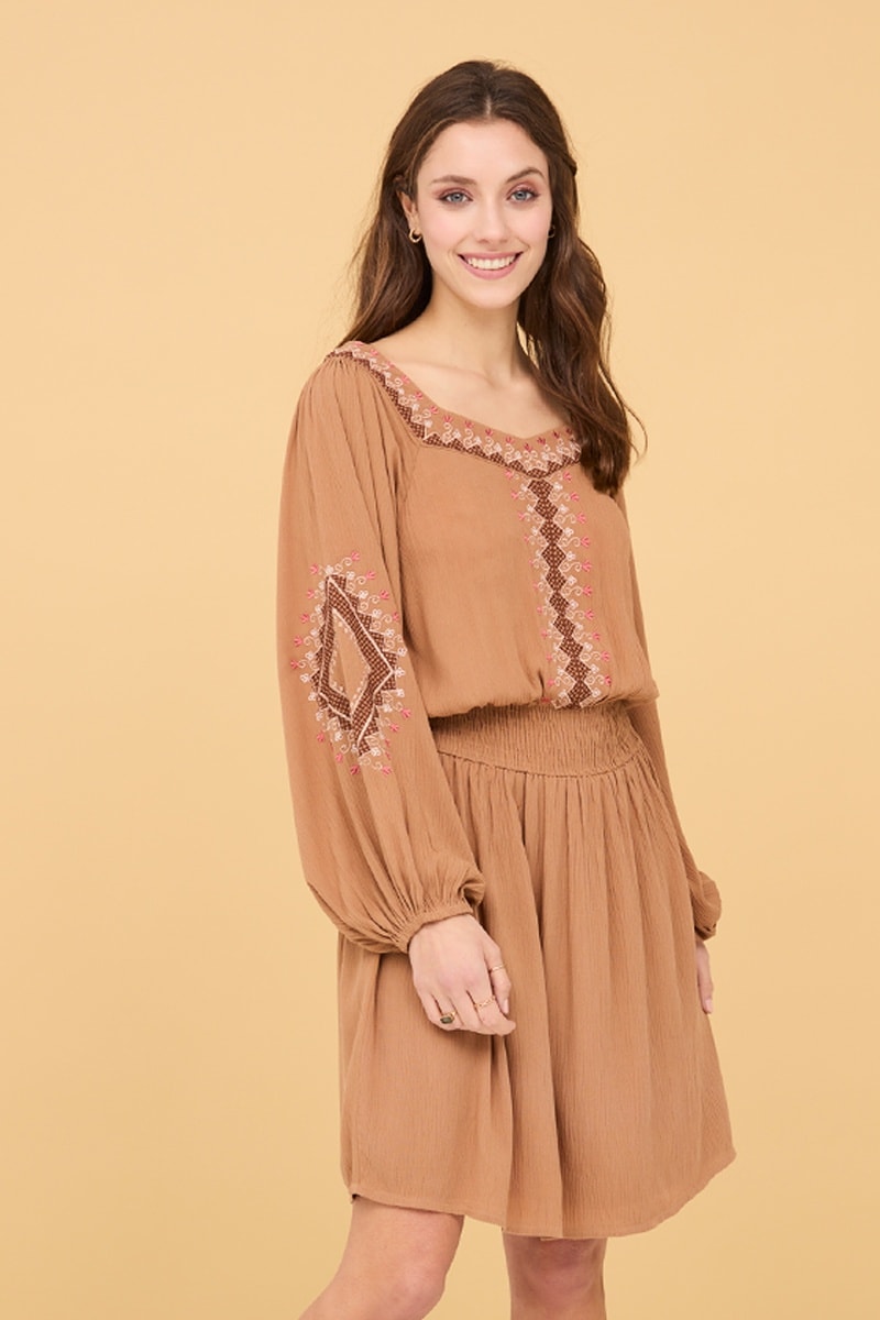 Motifs fantaisie brodés sur les manches et à l’encolure.