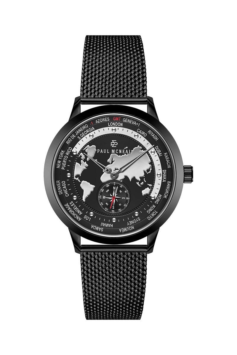 Montre à quartz en acier - GMT - Boussole - Noir et argenté