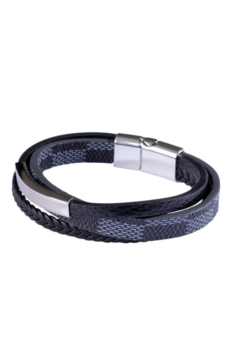 Bracelet en acier inoxydable et cuir synthétique.