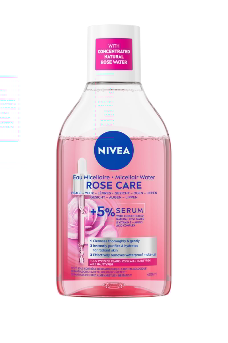 L’Eau Micellaire Nivea ROSE CARE, composée de 5% de sérum concentré en eau de rose naturelle, de vitamine E et d'un complexe d'acides aminés, offre un soin complet pour la peau.