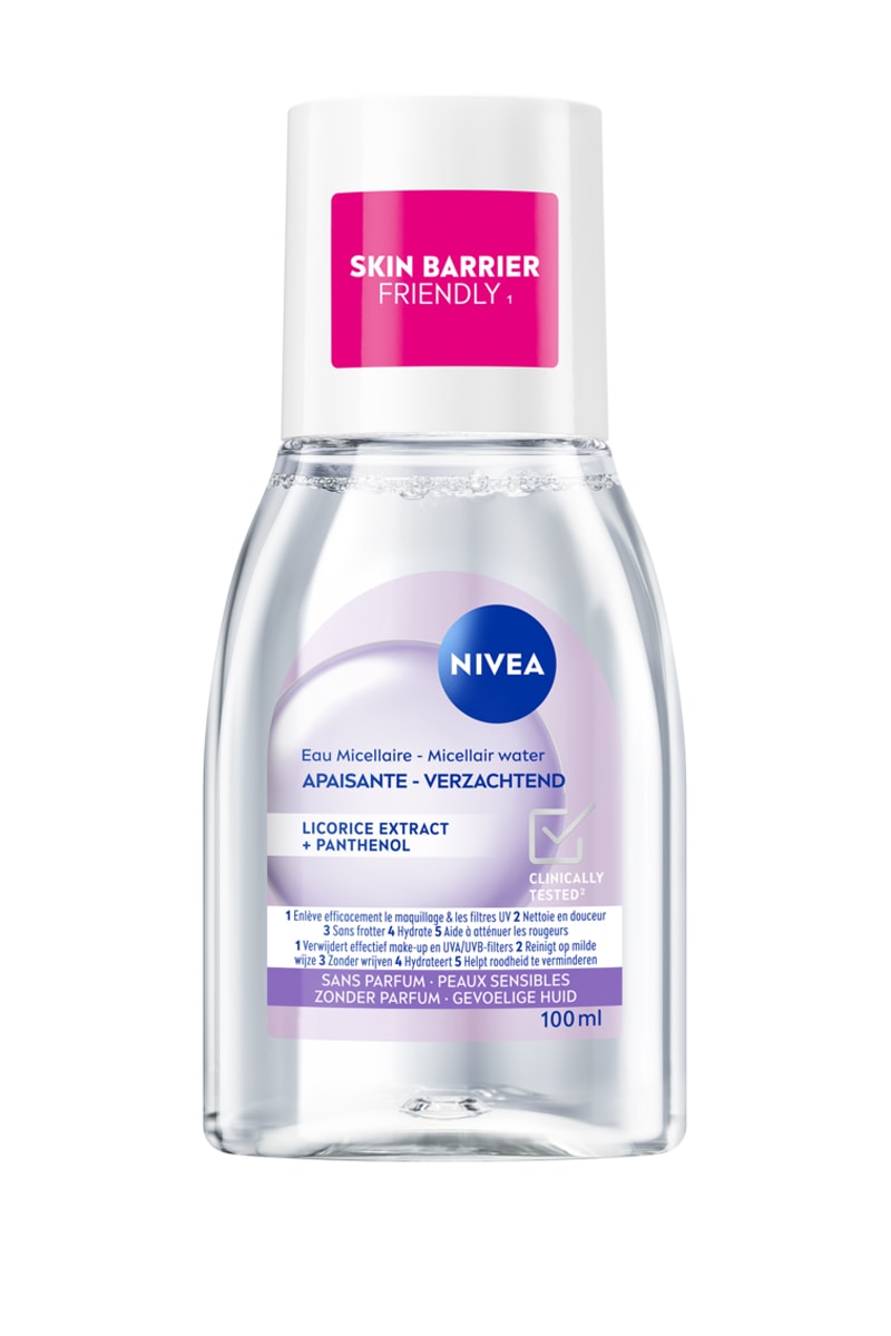 L'eau micellaire apaisante NIVEA, enrichie en complexe d'acides aminés et micelles, élimine le maquillage et les impuretés en douceur sans frotter ni rinçage.